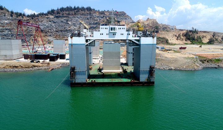 東區(qū)化工碼頭工程新建3個油品化工泊位(2個5萬噸級和1個1萬噸級)及配套設(shè)施,碼頭設(shè)計年吞吐量為510萬噸。該碼頭工程采用重力式沉箱結(jié)構(gòu)型式,使用ABCD四種類型沉箱共52件。沉箱高度17m,最大重量為2483.1t。本次出運安裝完成的C型沉箱長12.45m、寬12.45m、高17m,重1122.6t。