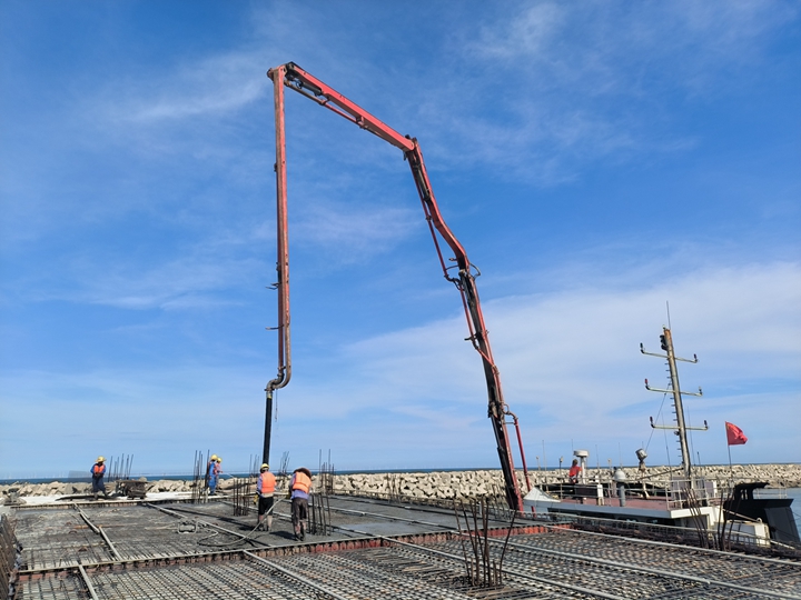 ▲油品碼頭工程水域公用管廊棧橋面層澆筑完成 本工程的公共管廊全長4384m,包括陸域公共管廊和水域公共管廊兩部分,水域公用管廊棧橋長度2400m,寬11m~15m,陸域公共管廊棧橋長1984m,寬10.5m~15m。其中陸域公共管廊棧橋橋面已經(jīng)于2021年10月份施工完成。本次施工完成的是水域公用管廊棧橋現(xiàn)澆面層,水域公共管廊棧橋面層是茂名港博賀新港區(qū)東區(qū)油品碼頭工程重要工程節(jié)點,更是整體工程的關(guān)鍵銜接點。