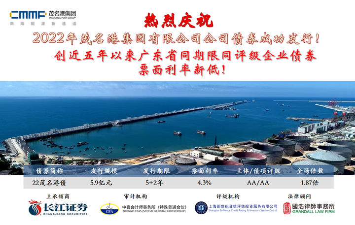 9月15日,2022年茂名港集團(tuán)有限公司公司債券成功發(fā)行,發(fā)行規(guī)模5.9億元,期限為5+2年,票面年利率4.3%,全場認(rèn)購倍數(shù)為1.87倍。本期債券創(chuàng)下票面利率新突破:創(chuàng)近五年以來全國同期限同評級企業(yè)債券第三低、廣東省同期限同評級企業(yè)債券票面利率新低! 在兩小時的簿記中,茂名港集團(tuán)公司債券得到多家金融機(jī)構(gòu)爭先認(rèn)購,使得本期公司債券利率一路走低,由4.8%降至4.3%,最終簿記當(dāng)天參與投標(biāo)的投資機(jī)構(gòu)超過20家,投標(biāo)認(rèn)購資金高達(dá)11.06億元。其中,14家投資機(jī)構(gòu)中標(biāo),發(fā)行票面利率為4.3%,為集團(tuán)節(jié)省了2095.32萬元財務(wù)成本。