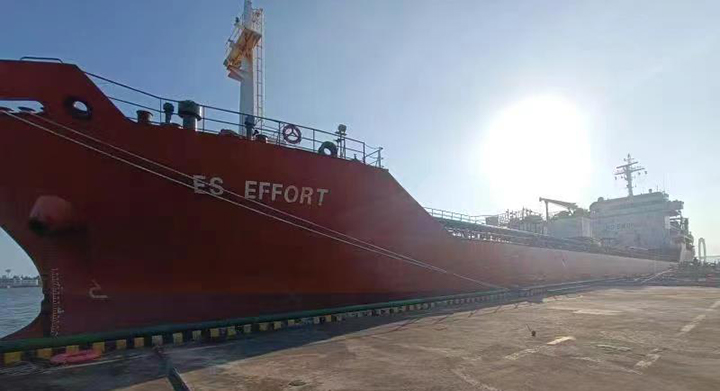 5月28日下午18時10分,裝載有2500噸基礎(chǔ)油的“永海奮進”號外輪在碼頭操作人員的精準(zhǔn)引領(lǐng)下順利靠泊中油王港公司碼頭1號泊位,這是三年多來靠泊的首艘外貿(mào)船舶。