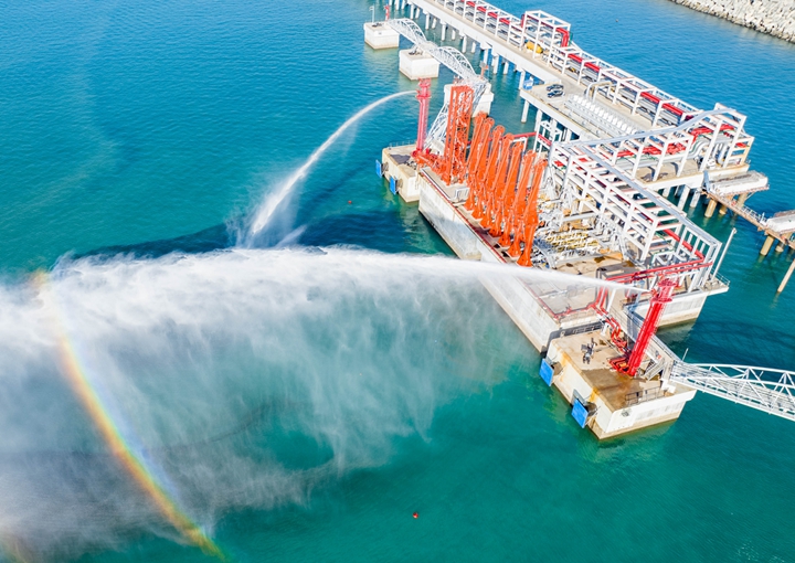 2023年12月7日下午,隨著公用工作樓首層消防泵房的紅色“巨獸”傳出一聲噪響,矗立10萬噸級(jí)成品油泊位兩側(cè)靠船平臺(tái)上的消防炮塔噴射出兩道水柱,標(biāo)志著茂名港博賀新港區(qū)東區(qū)10萬噸級(jí)成品油碼頭項(xiàng)目大型消防泵組和消防炮塔聯(lián)合運(yùn)行成功,為項(xiàng)目即將轉(zhuǎn)入運(yùn)營(yíng)提供消防安全保障。