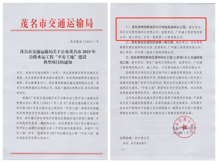 1月17日,茂名市交通運輸局公布了茂名市2023年公路水運工程“平安工地”建設(shè)典型項目的表彰名單,茂名港集團(tuán)下屬企業(yè)投資建設(shè)的茂名港博賀新港區(qū)30萬噸級原油碼頭工程被評為平安工地建設(shè)典型項目,榮獲“平安工地”稱號!